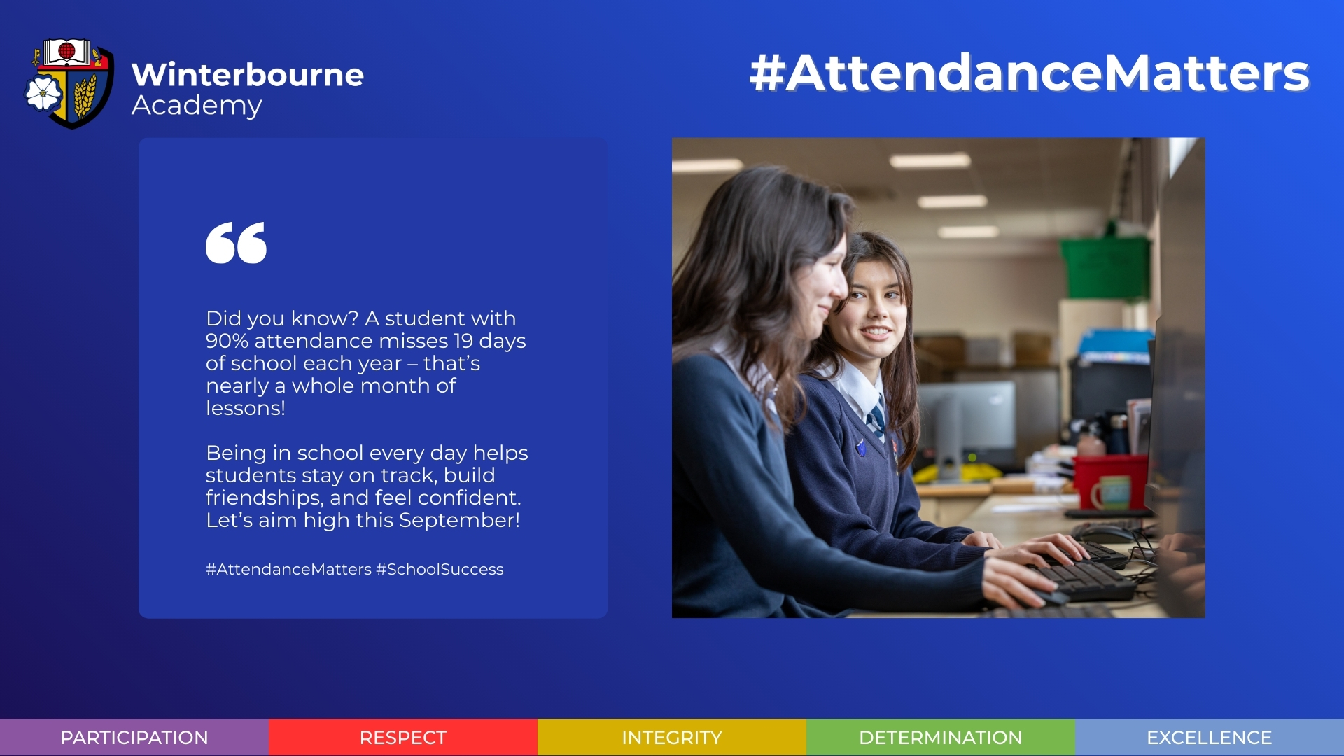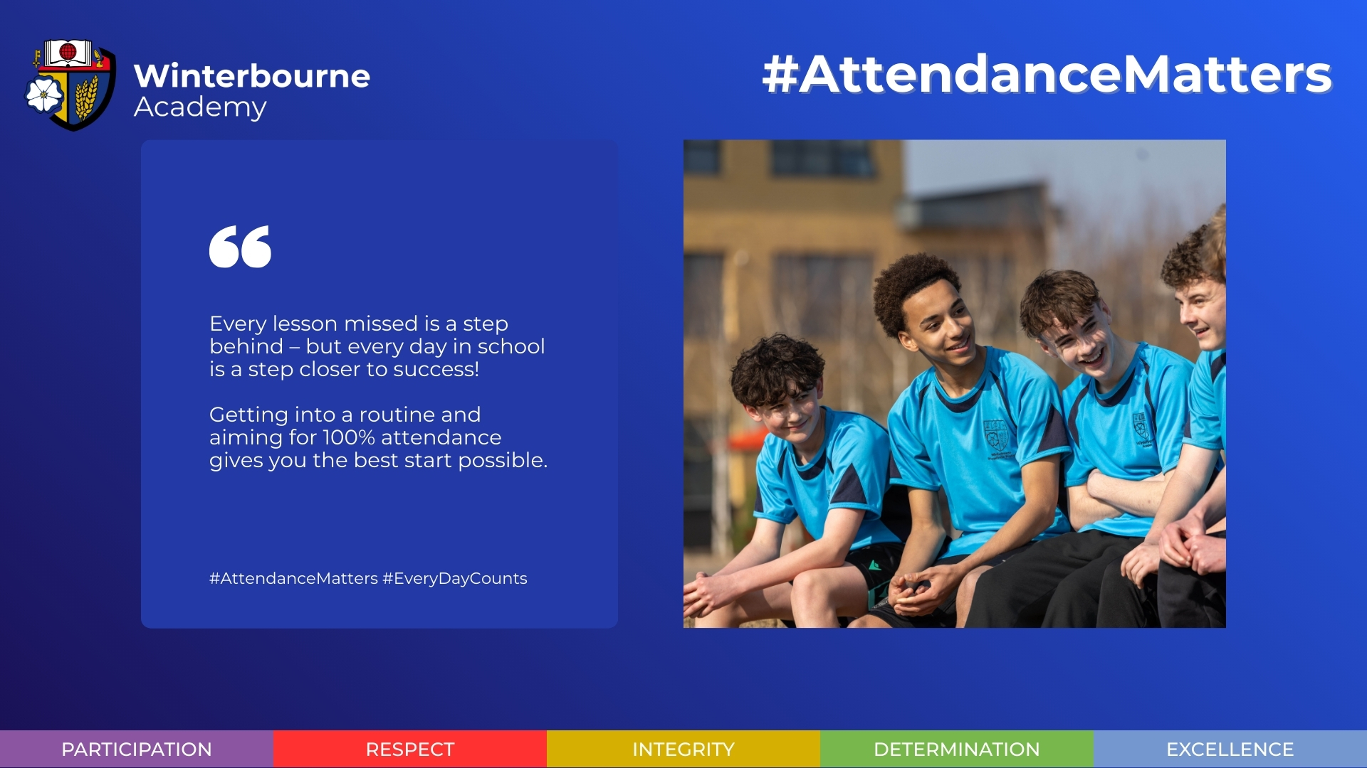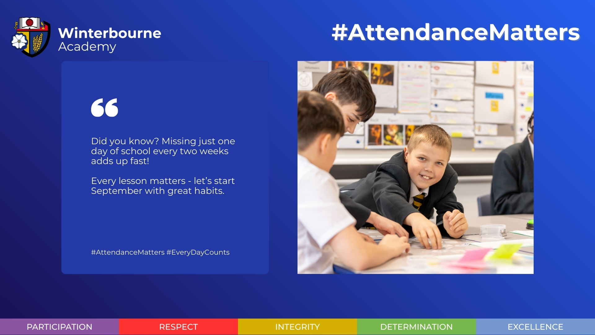 Winterbourne Academy and Olympus Academy Trust are passionate about attendance because being in school regularly really does matter! Making connections everyday with other children and staff builds belonging, which we believe is an essential component of a healthy, happy child.